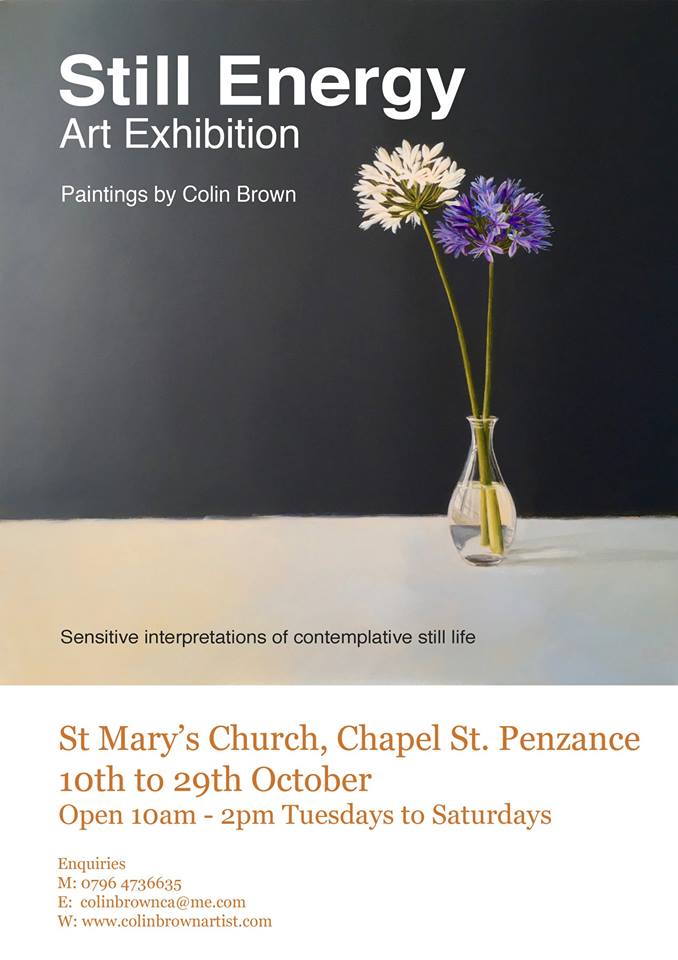 Krowji-based painter Colin Brown has an exhibition of work at St Mary’s Church Penzance this month, running from the 10th-29th October. Still Energy features his sensitive interpretations of contemplative still life and is open 10am -2pm Tuesday to Saturday.