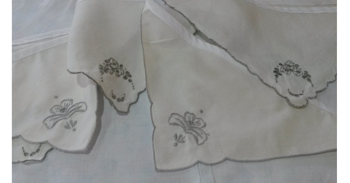 Another stash of favourite embroidered tablecloths, napkins and doilies are made into lengths of bunting. Beautiful in a sunny garden, they are equally at home around a bedroom or dresser.