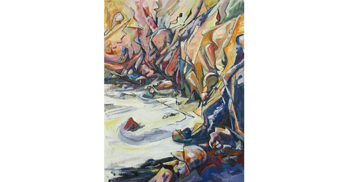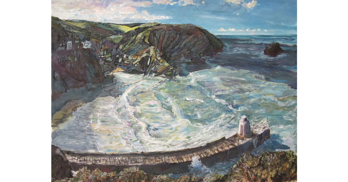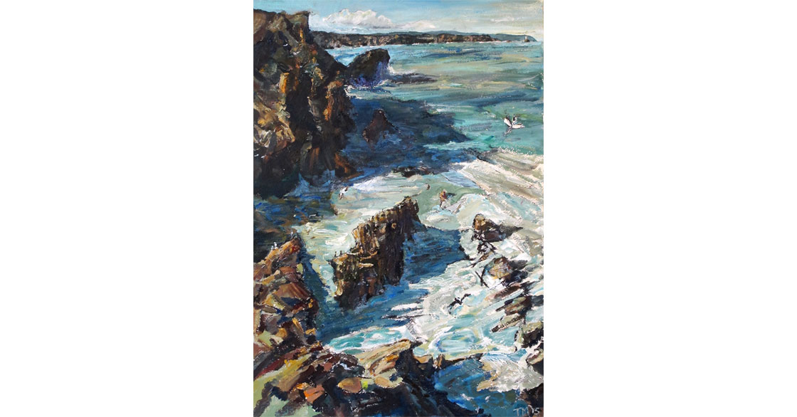 Tony Minnion works extensively as a painter in response to the local landscape – the impressive North Cliffs on the North Cornish coast – an awesome place of crashing seas, numerous caves and tall, crumbling rock faces.